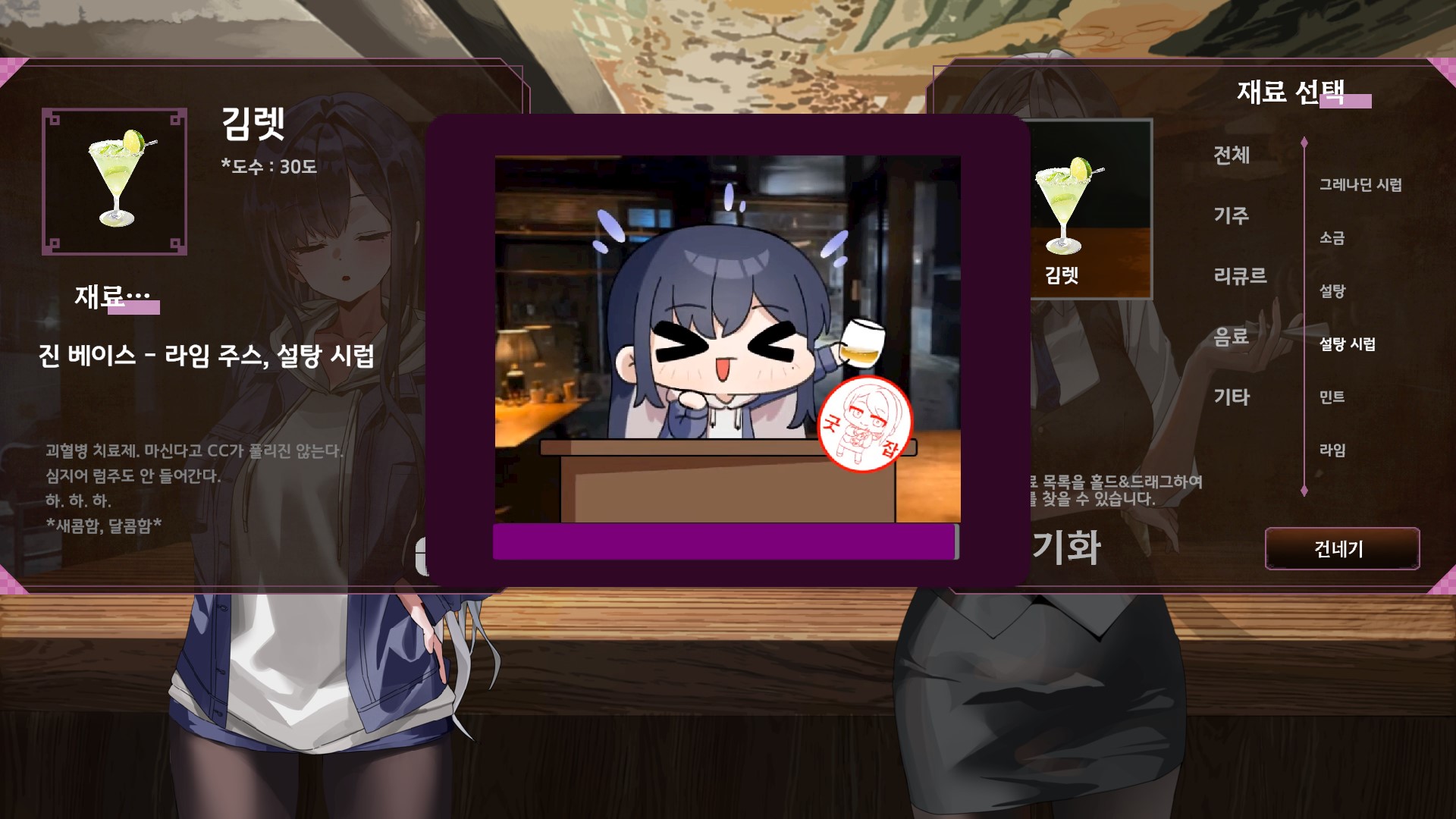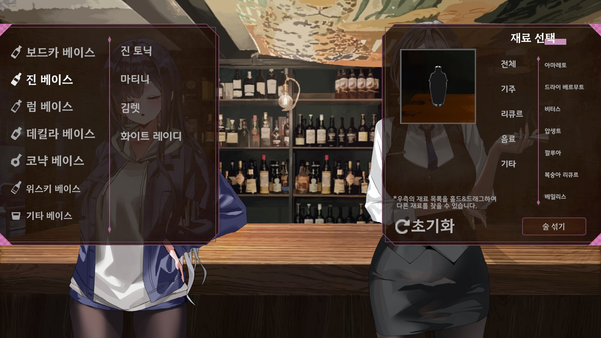 그것도 상당히 많은 종류의 레시피를 알려주는데, 그 중에서 하고싶은 칵테일을 만들어주면 그 칵테일에 맞는 상호작용 대사를 해준다고 한다.
