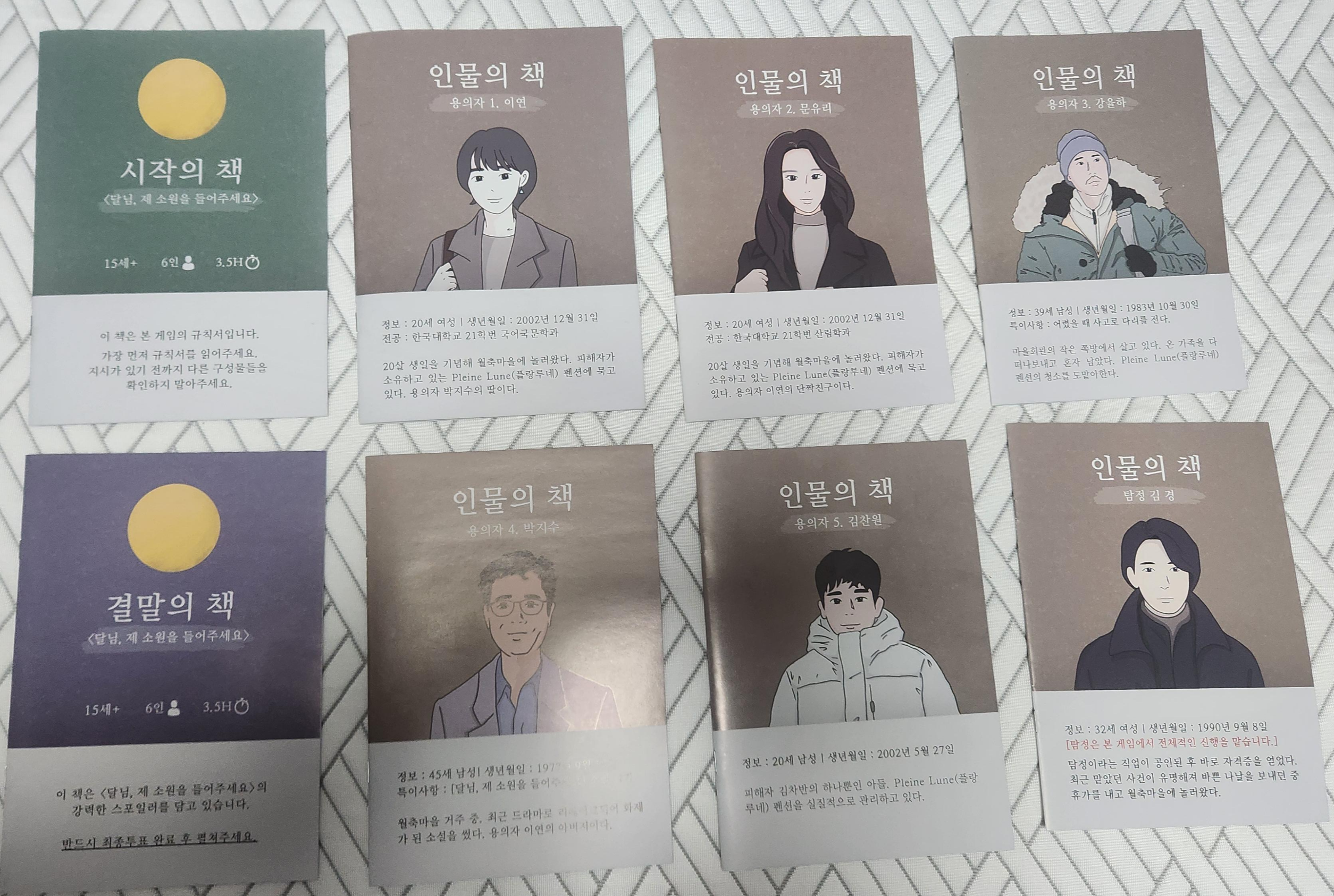 피해자의 펜션에 숙박 중이던 대학생 둘, 마을 회관 쪽방에서 살고 있는 주민, 소설<달님, 제 소원을 들어주세요>의 작가, 그리고 피해자의 아들