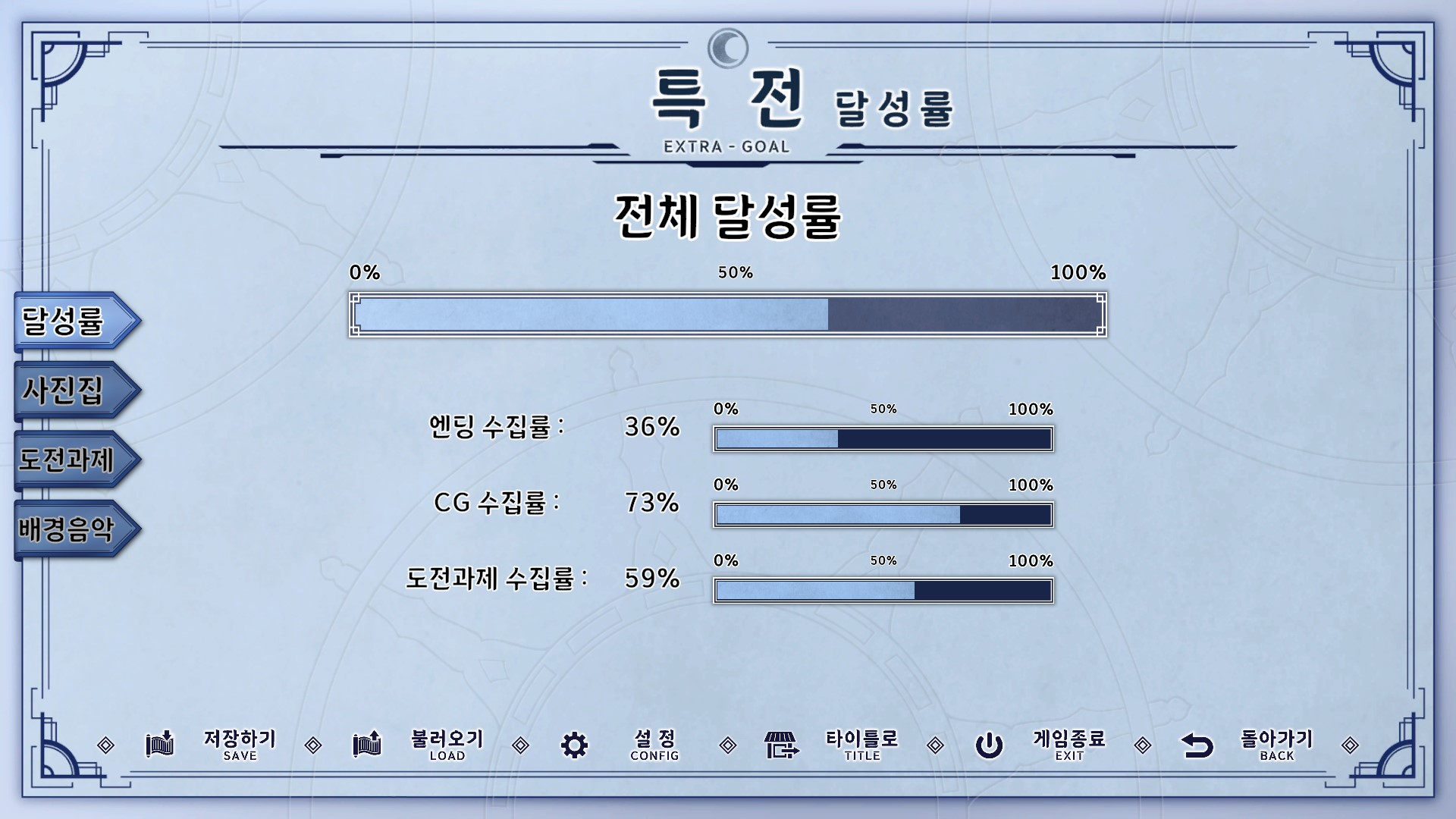 특이하게 엔딩,CG,도전과제 수집률이 따로 있는데 상당히 신경을 쓴 느낌이 보였다.